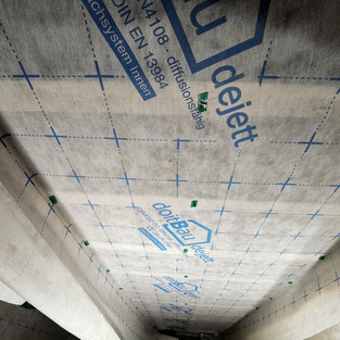 Hier könnt ihr die angetackerte Dampfbremsfolie sehen . . sie dient uns in zweierlei hinsicht . . zum einen als Unterspannbahn (da der Dachboden leider keine hat) und zum anderen für die Base der Dämmtaschen. . -->Eine Dampfbremse, auch Dampfsperre genannt, schützt den Dämmstoff im Gebäude vor Feuchtigkeit.